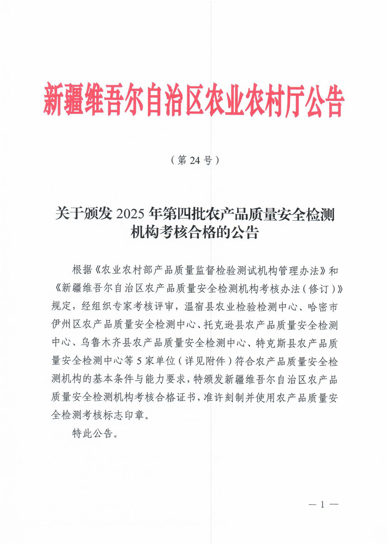 关于颁发2025年第四批农产品质量安全检测机构考核合格的公告